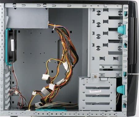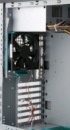 Инструкция по сборке отсутствует. Все заглушки для карт расширения заранее сняты, но их, при желании, можно установить. Задняя панель портов ввода/вывода стандартная, её можно с лёгкостью снять без использования дополнительных инструментов. Салазки системы безвинтового крепления зафиксированы специальным зажимом на нижней стенке корпуса. Зажим достаточно тугой, при его отгибании возникает ощущение, что он вот-вот сломается или вовсе оторвётся.