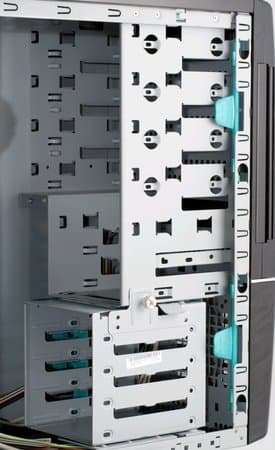 Устройства в пятидюймовом отсеке крепятся с помощью салазок, помеченных как "CD-ROM". Фиксация получается хлипкая, наблюдается ощутимый люфт, как в горизонтальной, так и в вертикальной плоскостях. Однако производитель предусмотрел возможность усилить крепеж за счёт двух винтов, после установки которых люфт заметно сокращается. Заметим, что, при желании, выломанные металлические заглушки на передней стенке можно закрепить на прежнее место при помощи двух винтов.