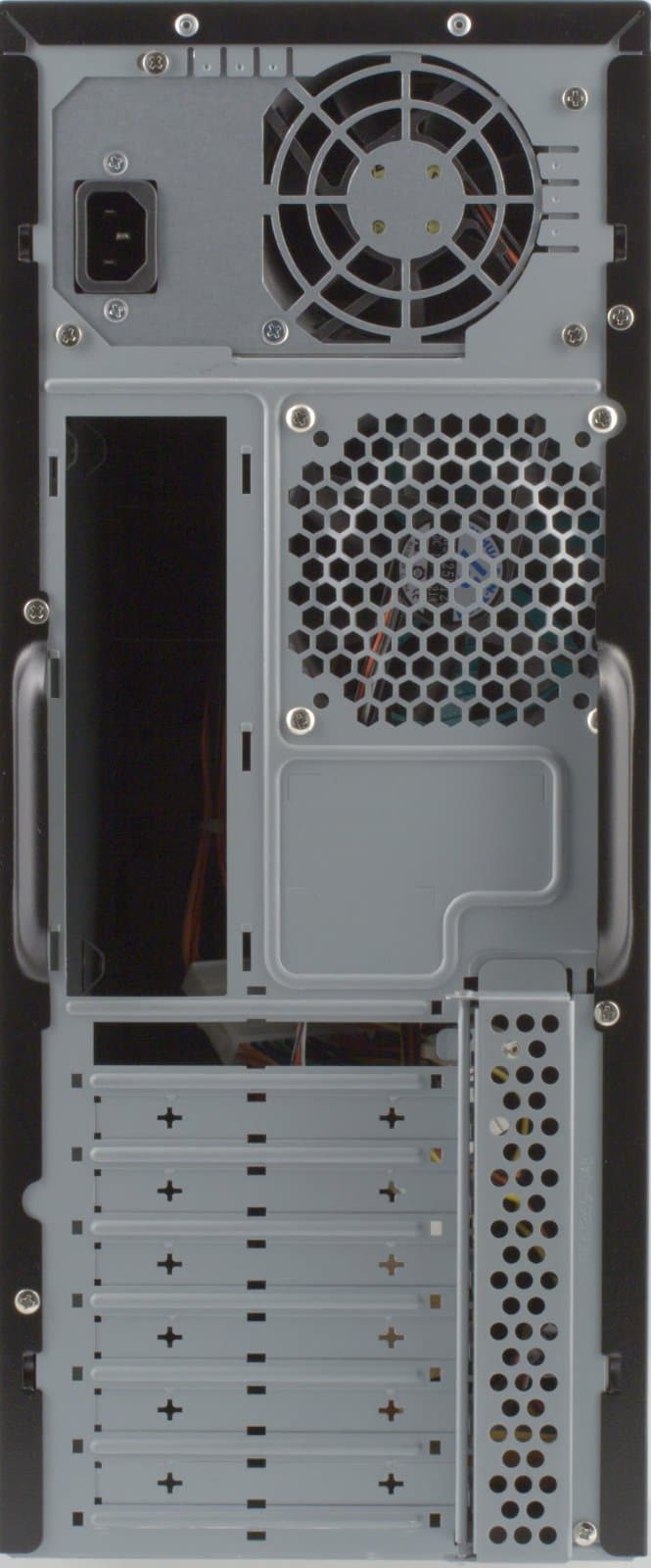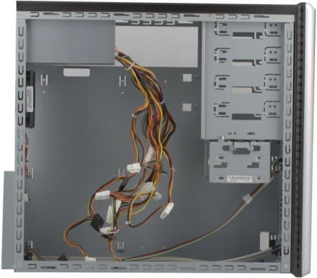 Все стенки корпуса (включая заднюю) радуют своей толщиной, которая составляет 0,8 мм. Прогнуть хотя бы заднюю стенку сильным нажатием пальцев практически невозможно. Крепятся обе боковые стенки на обычных винтах под крестовую отвертку. Декоративная передняя панель выполнена из достаточно качественного пластика, снимается она быстро и полностью (все кнопки и разъёмы закреплены непосредственно на шасси корпуса).