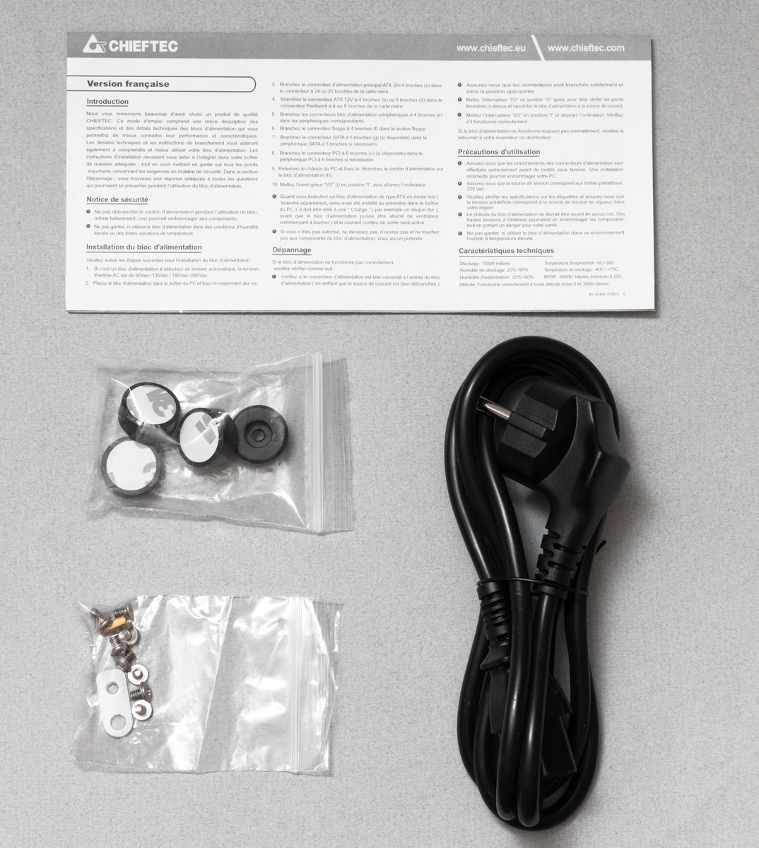 Корпус поставляется в компактной коробке из обычного картона без ручек и прорезей для более удобной транспортировки. В комплект поставки помимо самого корпуса и элементов системы охлаждения входит блок питания SFX-350BS-L, кабель питания, неполный комплект монтажных винтов (для установки 2,5″ накопителя придется искать винты самостоятельно) и небольшая бумажка с просьбой соблюдать технику безопасности. Инструкции по сборке в комплекте поставки нет, с сайта производителя можно скачать только слегка помятый скан на английском языке — мелочь, но неприятно.