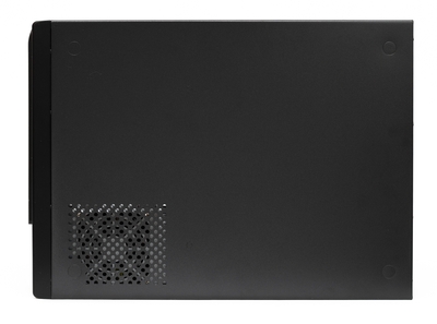 На обеих боковых стенках присутствуют вентиляционные отверстия: на левой — для лучшего охлаждения блока питания, а на правой — для единственного корпусного вентилятора. Но больше всего отверстий для выхода горячего воздуха находится на верхней стенке, в области центрального процессора. Этот факт несколько усложняет использование FN-03B в классическом Desktop-формате: подставка монитора с большой долей вероятности будет закрывать если не все, то значимую часть отверстий, и в таких условиях центральному процессору придется весьма несладко.