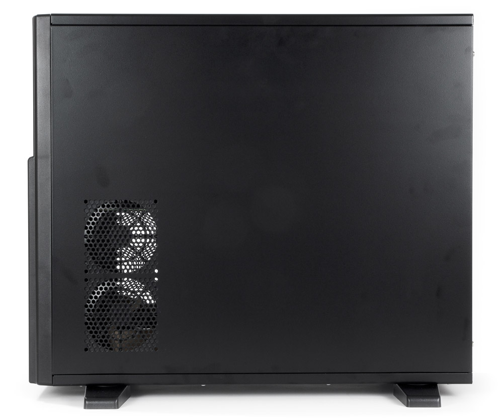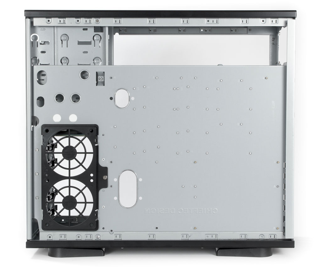 Мест для установки вентиляторов в корпусе пять. Одно, как обычно, на задней стенке (120 мм), два 92-миллиметровых на съемной левой панели в зонах размещения процессора и плат расширения, и еще два 92-миллиметровых… а вот и не угадали: установка вентиляторов на лицевой панели не предусмотрена вовсе, а для охлаждения HDD вентиляторы устанавливаются на правой стенке корзины с помощью специальной рамки. Они будут обдувать диски не сбоку, а с торца, что в целом неплохо.