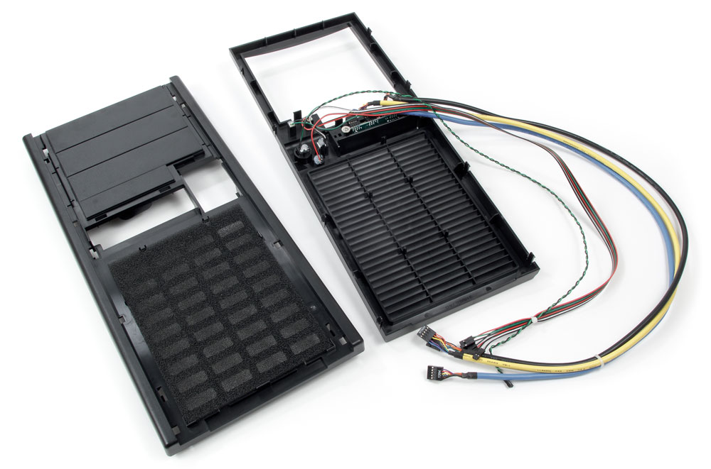Подключение фронтальных разъемов выполняется монолитными коннекторами. Их кабели экранированы, аудиокабель имеет только разъем HD Audio. Сами фронтальные разъемы, а также кнопки и индикаторы закреплены на пластиковой передней панели, к тому же идущие от них провода зафиксированы на шасси, мешая снятию панели (она крепится стандартно — шестью пластиковыми защелками), однако снимать ее на этапе сборки не потребуется: извлечь заглушки 5- и 3,5-дюймовых слотов можно и снаружи, с помощью плоской отвертки или ножа.