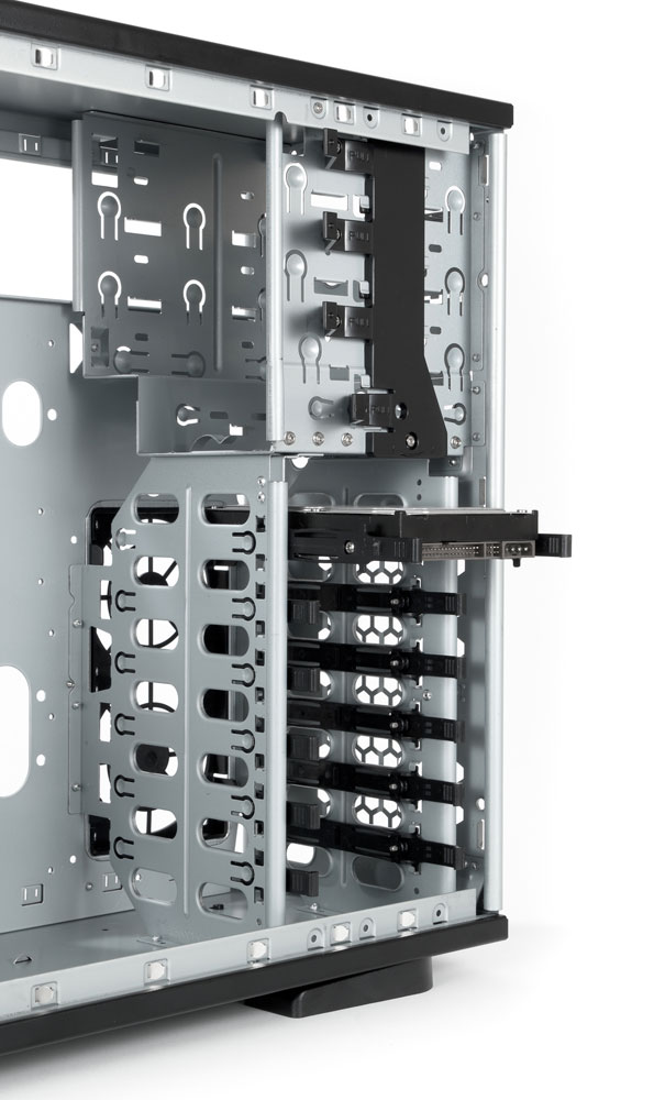 К сожалению, сказанное относится только к 3,5-дюймовым дискам: конструкция салазок вообще не предусматривает установку 2,5-дюймовых HDD/SSD.