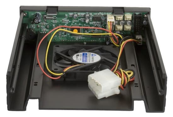В боковых стенках имеются восемь крепежных отверстий, по четыре с каждой стороны. Крепится устройство точно так же, как и любые оптические приводы для 5,25’’ отсека.