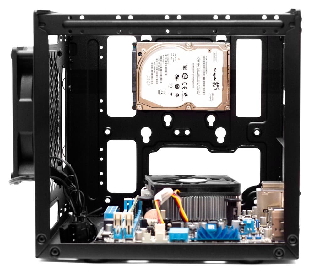 Посадочных мест для дисковых накопителей всего четыре. Два расположены на специальном плоском кронштейне в верхней части над блоком питания, а еще два — на левой внутренней части шасси. Три из четырех мест являются универсальными, а на последнее, четвертое место можно установить только 2,5″ накопитель ноутбучного формата.