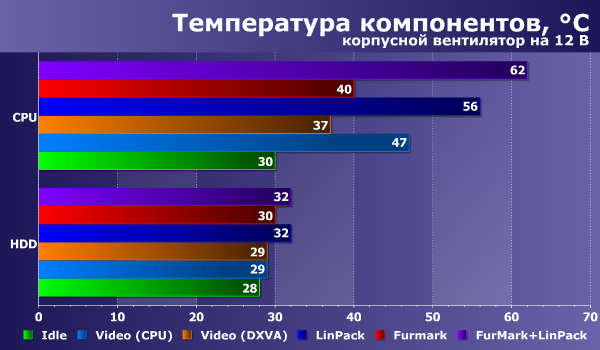 Эта конфигурация является унифицированной для тестирования всех малогабаритных корпусов, поэтому в нее входит 2,5″ жесткий диск и процессорный кулер с высотой, близкой к минимальной. Температура в помещении во время всех тестов остается неизменной и составляет 24 градуса. Регистрация значений температуры производилась программой SpeedFan в следующих режимах:
