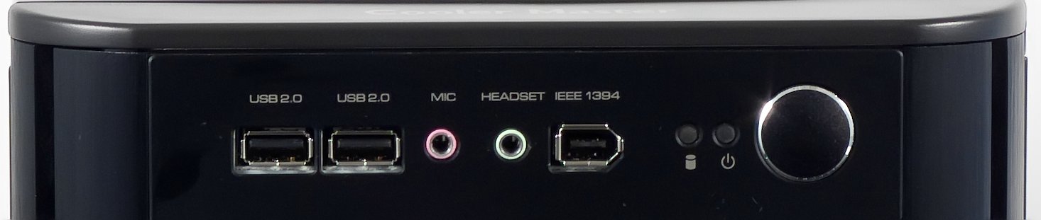 В верхнем блоке представлены расположенные в ряд: два порта USB, аудио разъемы для микрофона и наушников, один порт IEEE 1394 (FireWire) и большая круглая кнопка включения. Механизм кнопки выполнен качественно, люфт и болтания полностью отсутствуют. А вот для кнопки сброса места на передней панели не нашлось вовсе, поэтому в случае зависания придется прибегнуть к полному выключению компьютера.