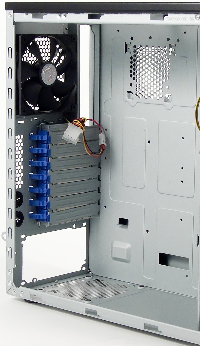 Корзина для жестких дисков крепится тремя комплектами защелок и, вдобавок, четырьмя винтами под крестовую отвертку. Извлекать её удобнее всего через переднюю стенку. Сами дисковые накопители прикручиваются к корзине через толстые резиновые прокладки, снижающие шум от вибрации, но ухудшающие тепловой контакт HDD с корзиной.