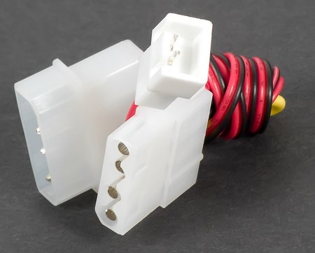 Комплектные вентиляторы крепятся к корпусу и корзине для HDD обычными винтами, в связи с чем их демонтаж и замена не представляют сложности. Подключаются они двумя способами: стандартным трехконтактным разъемом к системной плате или же четырехконтактным разъемом к блоку питания через идущий в комплекте удлинитель. Очень удачное решение.
