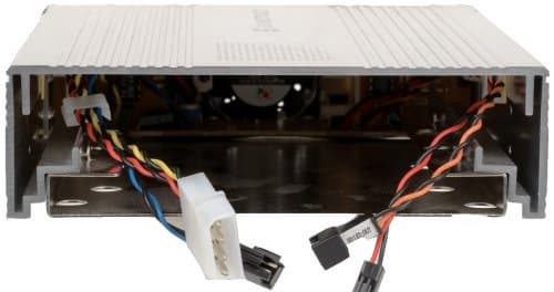 Нижняя стенка, как и у CoolDrive 4, является съемной. После её демонтажа открывается доступ к обратной стороне передней панели, правда, нужен он только для отключения комплектного вентилятора, если в этом возникнет необходимость. Остальные провода являются несъемными. Они разбиты на две группы, собраны в стяжки и зафиксированы на боковых стенках с помощью двухстороннего скотча. Данное обстоятельство ощутимо упрощает установку и снижает аэродинамическое сопротивление потоку воздуха, проходящего через внутренности устройства, что в свою очередь должно помочь снижению шума при его работе.