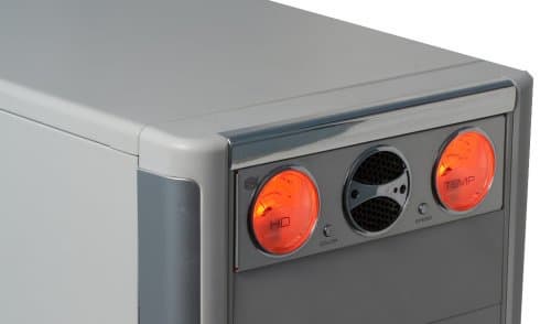 На передней панели располагаются два аналоговых индикатора, диаметром 35 мм каждый, и защитная решетка для встроенного вентилятора, выполняющая одновременно функцию пылевого фильтра. Также на передней панели нашлось место двум небольшим кнопкам: левая отвечает за цвет фоновой подсветки, а правая изменяет скорость вращения встроенного вентилятора.