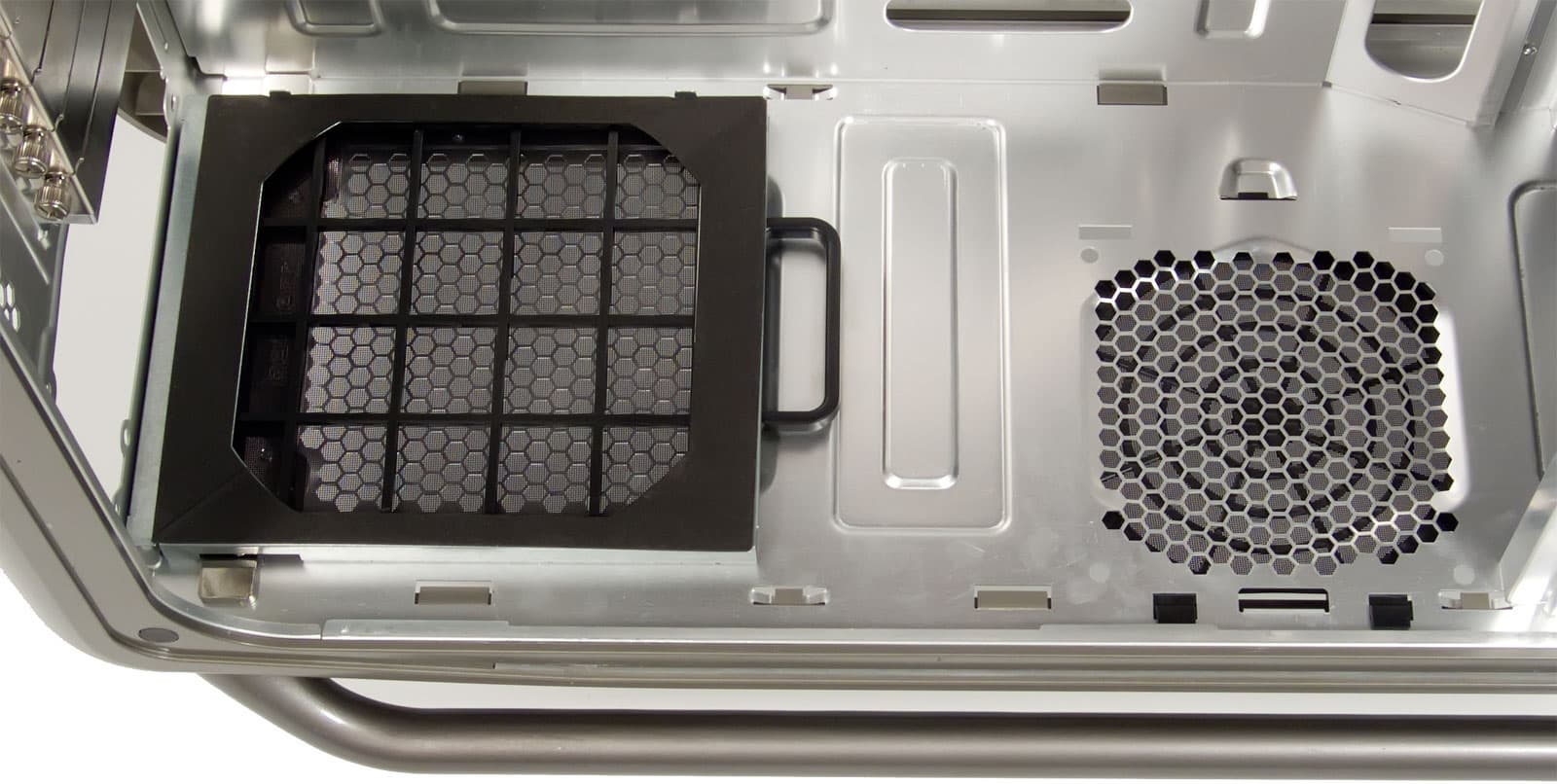 Шасси корпуса построено с применением нижерасположенного БП и верхнего «выхлопа». Данное решение уже доказало свою эффективность и продолжает набирать популярность, особенно среди геймерских корпусов. На нижней стенке имеется съемный пылевой фильтр для блока питания со 120 мм вентилятором, а также место для установки еще одного корпусного вентилятора типоразмера 120 мм. Оно также оснащено легко снимаемым фильтром от пыли, только он находится не на внутренней, а на внешней стороне нижней стенки.