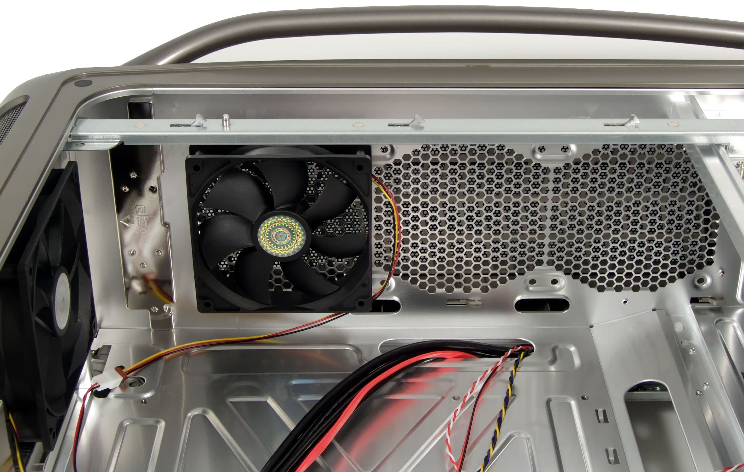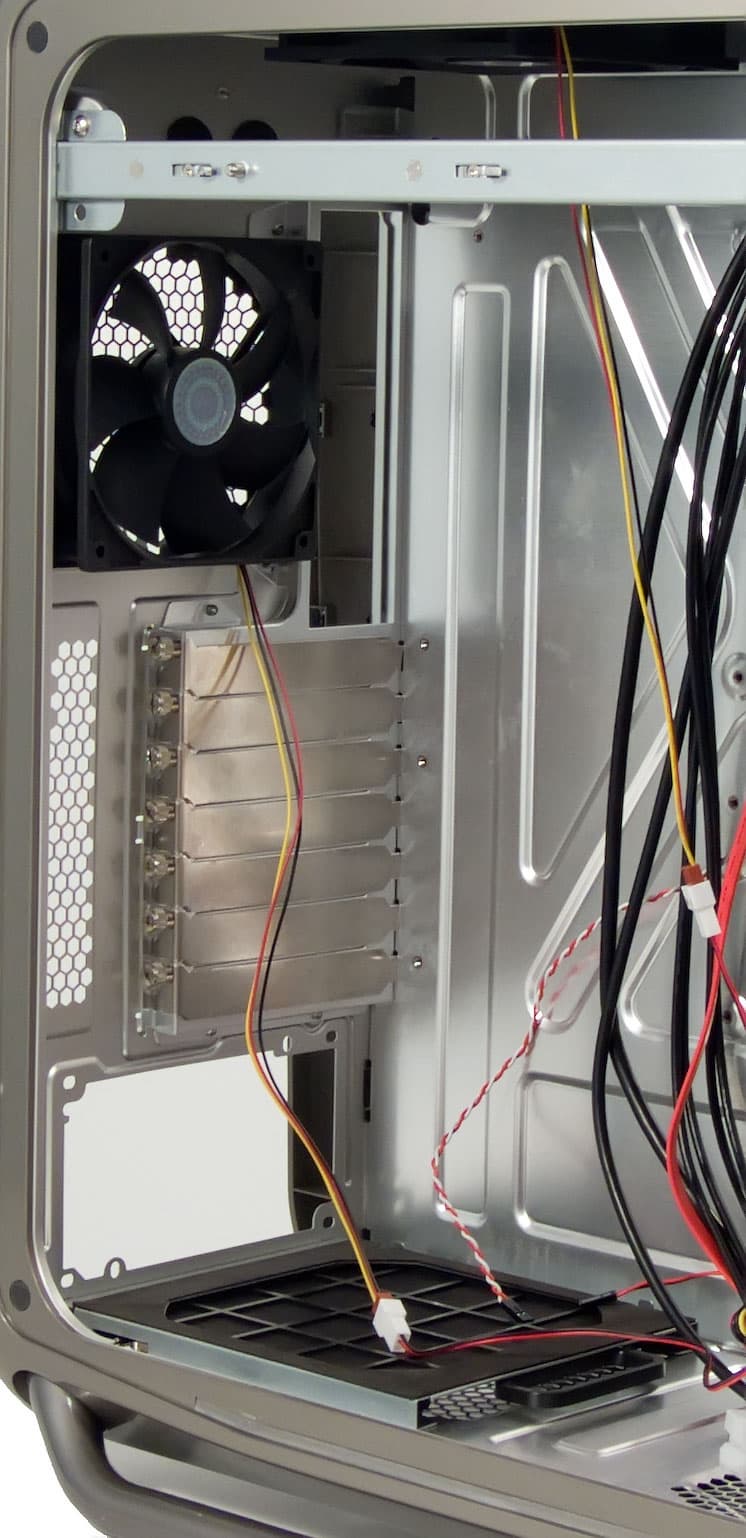 Кроме того, еще два места под 120мм вентиляторы есть на верхней стенке корпуса. Таким образом, в общей сложности, шасси Cosmos S предусматривает установку семи корпусных вентиляторов, чего должно быть достаточно для охлаждения самого горячего железа даже в самый жаркий летний день.