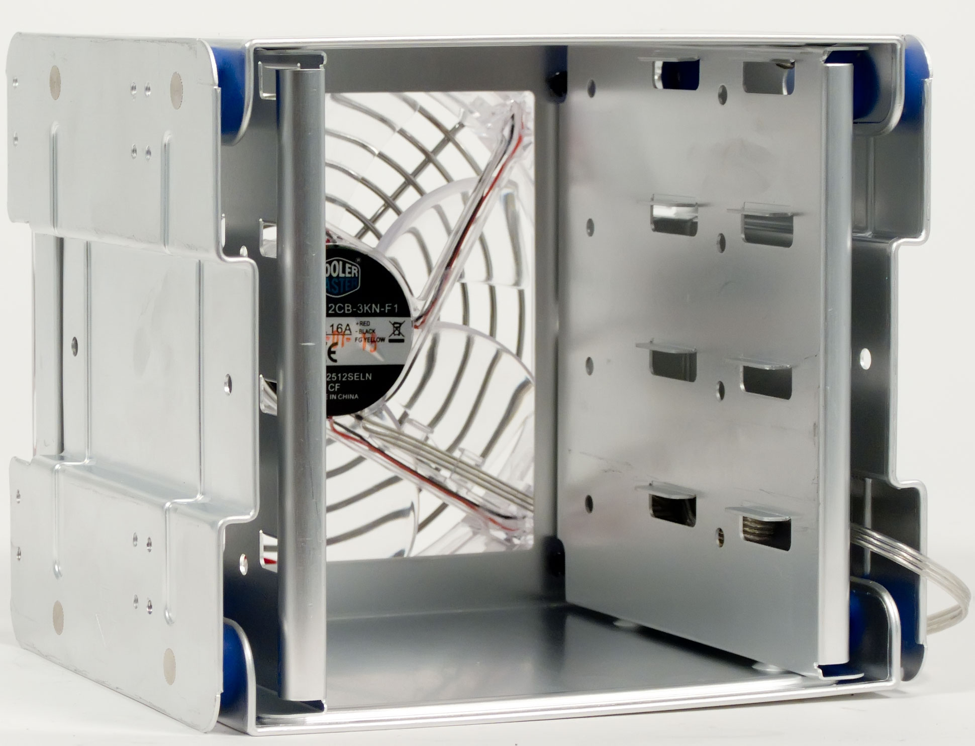 Все основные части шасси выполнены уже из не столь толстого и прочного металла, но, тем не менее, ощущаются достаточно прочными. Все десять отсеков для установки 3,5'' и 5,25'' устройств сделаны абсолютно одинаково. В каждый из них можно установить устройство, аналогичное по габаритам стандартному оптическому приводу. Установка 3,5'' устройств с внешним доступом требует использования специальных накладок, один комплект которых поставляется вместе с корпусом. Жесткие диски устанавливаются в съемную корзину на четыре посадочных места.