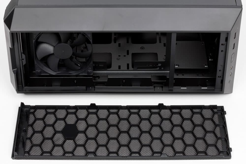 А вот фильтры имеются — спереди и снизу, в месте установки блока питания, причем быстросъемные. Фронтальный сделан в виде капроновой сетки, вместе с декоративной металлической решеткой закрепленной на съемной рамке, которая вставляется в лицевую панель. Чтобы извлечь эту рамку, снимать всю панель не надо: достаточно нащупать снизу углубление и потянуть нижний край рамки вперед.