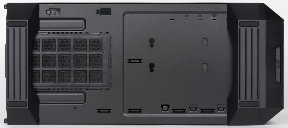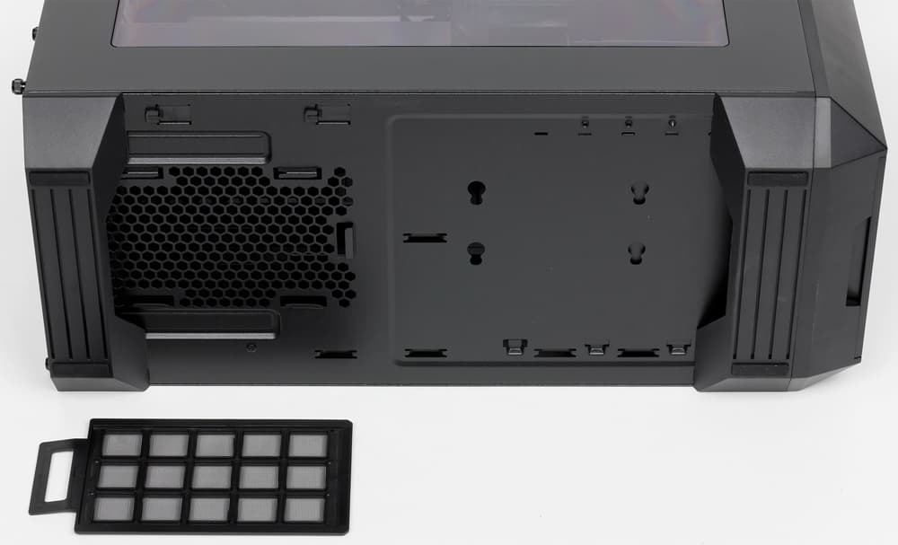 Смысл еще одной опции остается непонятным даже безотносительно доступности в розничной торговле: это 5,25-дюймовый отсек на два места. Устройства такой размерности обычно требуют выхода на лицевую панель, то есть подразумевают наличие соответствующих прорезей и в передней плоскости шасси, и (главное!) на лицевой панели, причем со съемными заглушками. В шасси окно есть, и в рамке лицевой панели тоже, но выход наружу организовать не получится: фронтальный фильтр с декоративной решеткой занимает весь проем снизу доверху.