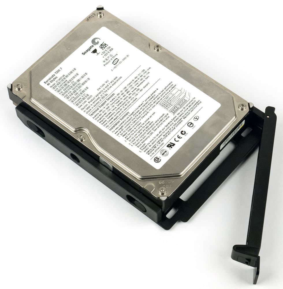 3,5-дюймовый накопитель крепится в корзине боковыми штифтами, оснащенными резиновыми амортизаторами, предусмотрены и отверстия для дополнительного крепления винтами, по одному с каждой стороны. Их можно использовать и для фиксации корзины с диском в стойке — в ее стенках тоже есть отверстия, только винты придется брать подлиннее.