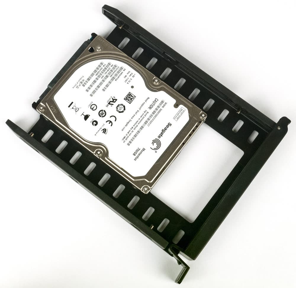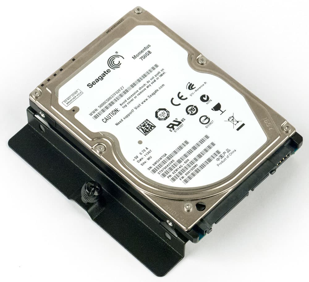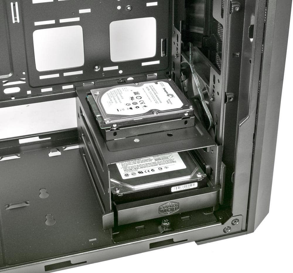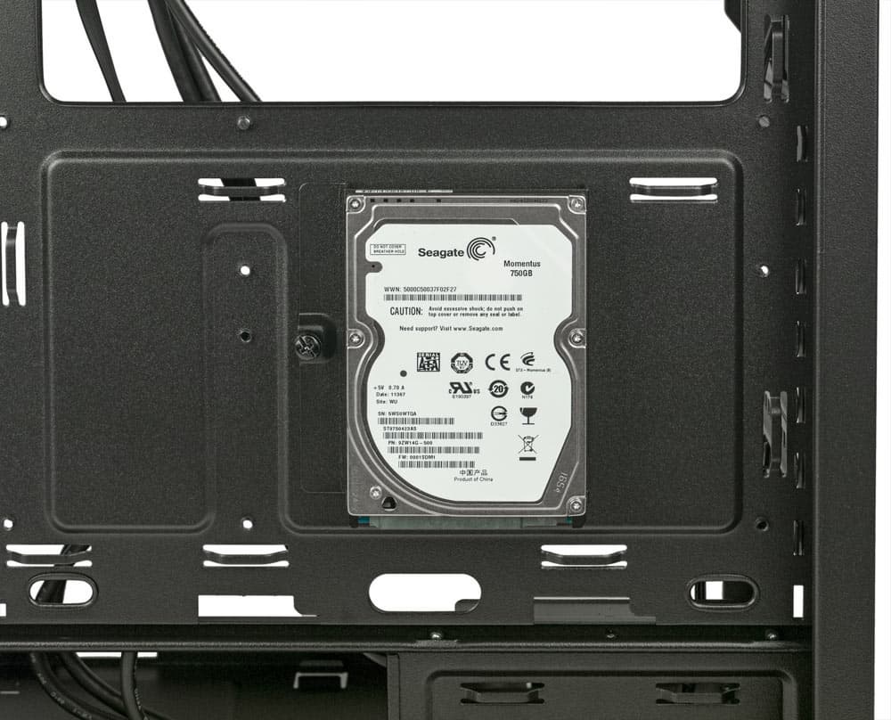 Еще один накопитель размером 2,5 дюйма можно установить на съемный контейнер, закрепляя винтами. Контейнер крепится к основанию для системной платы двумя штампованными выступами-зацепами и одним невыпадающим винтом с накатной головкой.