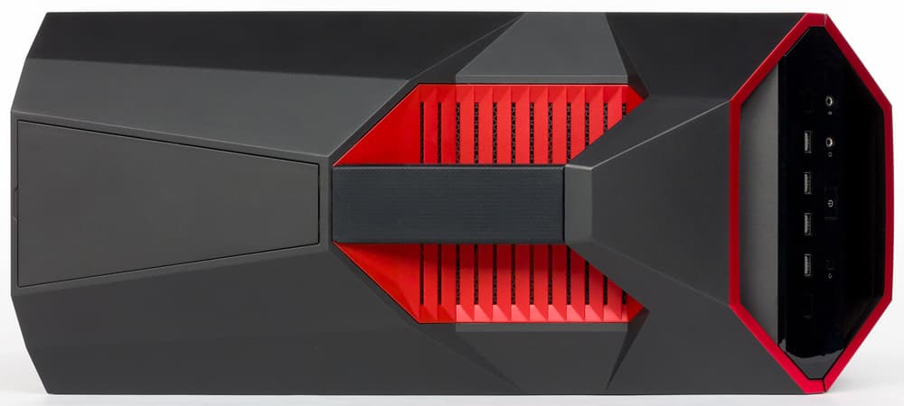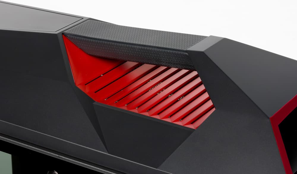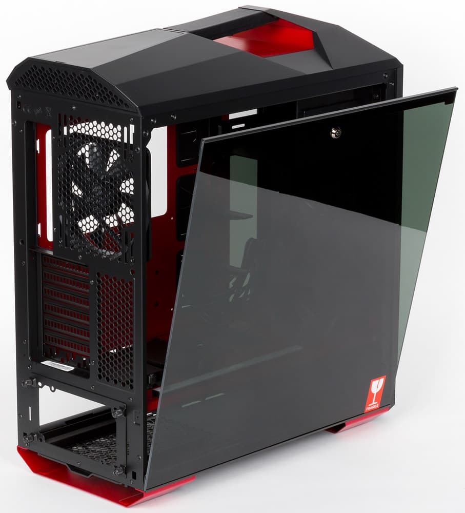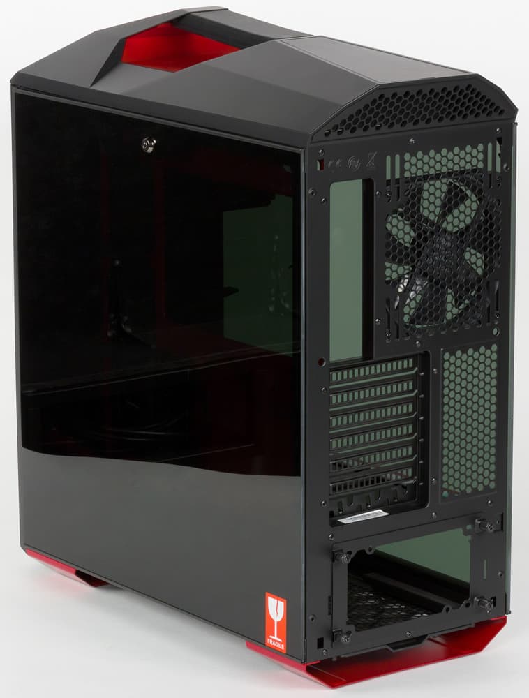 В экстерьере ровные плоскости стеклянных боковин соседствуют со сложным рельефом верхней панели, а ломаные линии, сосредоточенные вверху, сочетаются с более простыми трапециями, образующими переднюю крышку. При всём этом внешний вид корпуса в достаточной мере сбалансированный, чтобы не вызывать чувства неприятия или протеста ни в отношении цвета, ни в плане сочетаемости геометрии отдельных частей.