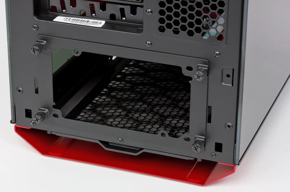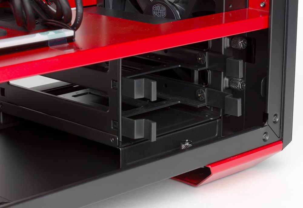 Посадочное место для дисковой стойки в нижнем объеме корпуса оснащено дополнительной подставкой, смысл которой вовсе не только в повышении прочности крепления (хотя и в нём тоже: фиксирующих отверстий справа для этой позиции нет — подложка системной платы заканчивается на уровне перегородки), использованная конструкция обеспечивает возможность сместить стойку вглубь корпуса на одну из двух дополнительных позиций, освобождая спереди место для установки радиатора СВО. Подставка справа имеет выступы, входящие в пазы днища, а слева закрепляется винтом с накатной головкой. Если она перемещается со штатного места, то стойку уже нельзя будет прикрепить к фронтальной вертикальной планке, и придется фиксировать ее на подставке винтами, для которых предусмотрены отверстия.