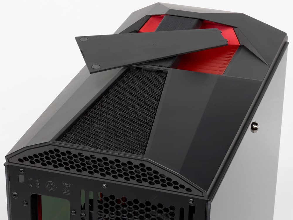 Сама верхняя панель, изготовленная из пластика, тоже имеет непростую геометрию, зато снимается она легко, поскольку крепится магнитами. В ее задней части имеется люк в форме трапеции, под крышкой которого скрываются вентиляционные отверстия, закрытые декоративной решеткой.