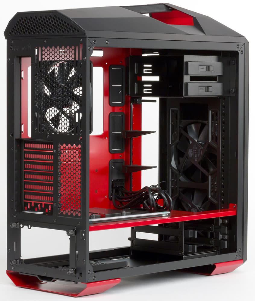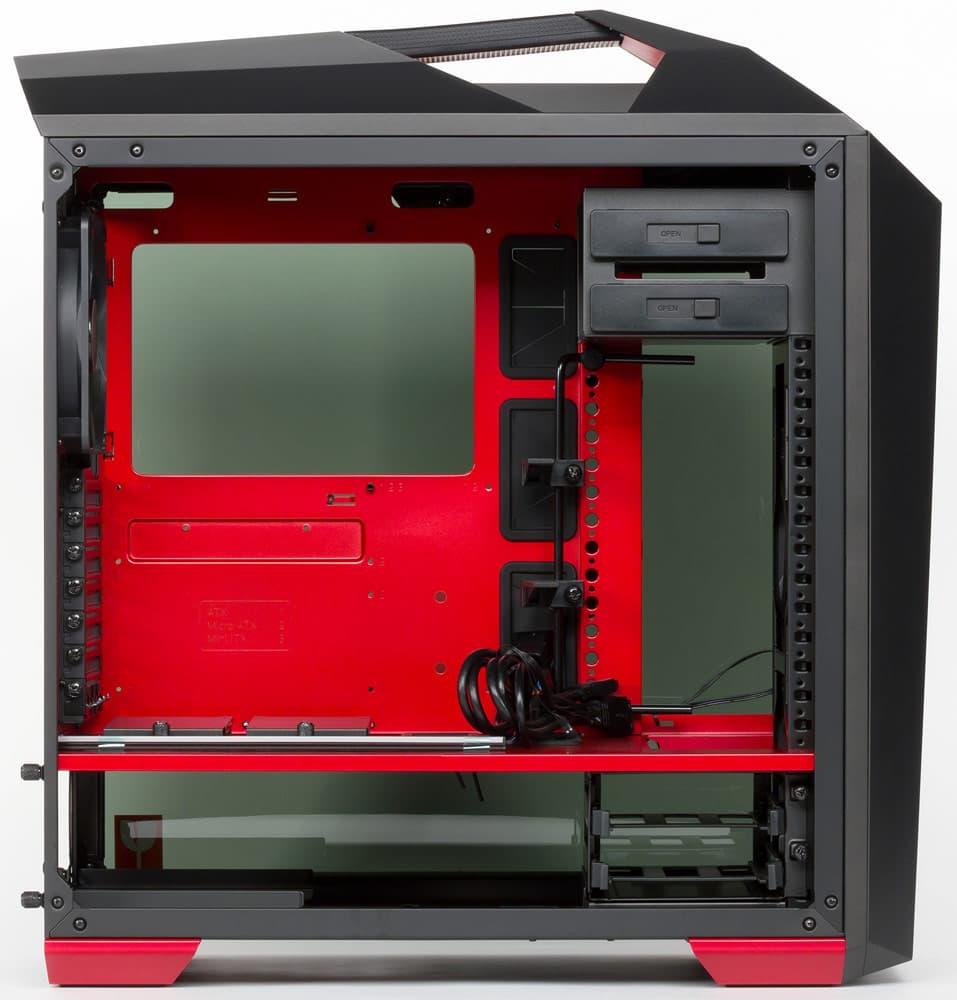 Несмотря на то, что в корпусах современной разработки всё чаще наблюдается отказ от пятидюймовых слотов, в MasterCase Maker 5t таких слотов два, оба с выходом на лицевую панель. А вот для 3,5-дюймовых устройств подобного выхода не предусмотрено.