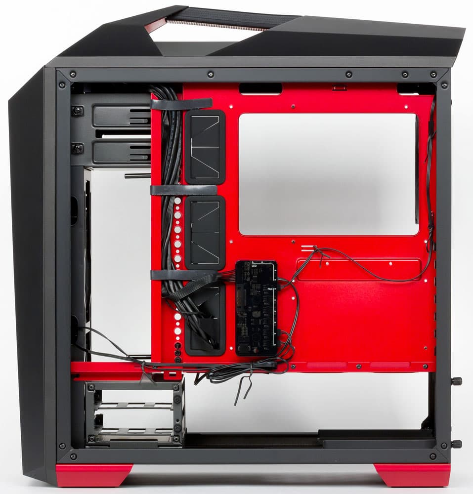 Cooler Master MasterCase Maker 5t имеет очень внушительный и не менее оригинальный вид, чему в немалой степени способствует выбранная окраска: сочетание разных оттенков черного, образуемых отличиями в фактуре, с металлическим отливом красного (не яркого алого, а более приглушенного, ближе к малиновому) навевает мысли о тлеющих в камине поленьях. Это впечатление еще более усиливается при включении красной подсветки, которую обеспечивает отрезок светодиодной ленты, оформленный в виде вытянутого плоского светильника с магнитной полосой в основании, благодаря которой подсветку можно размещать в разных местах внутреннего объема корпуса или убрать вообще, если владелец посчитает ее излишней.