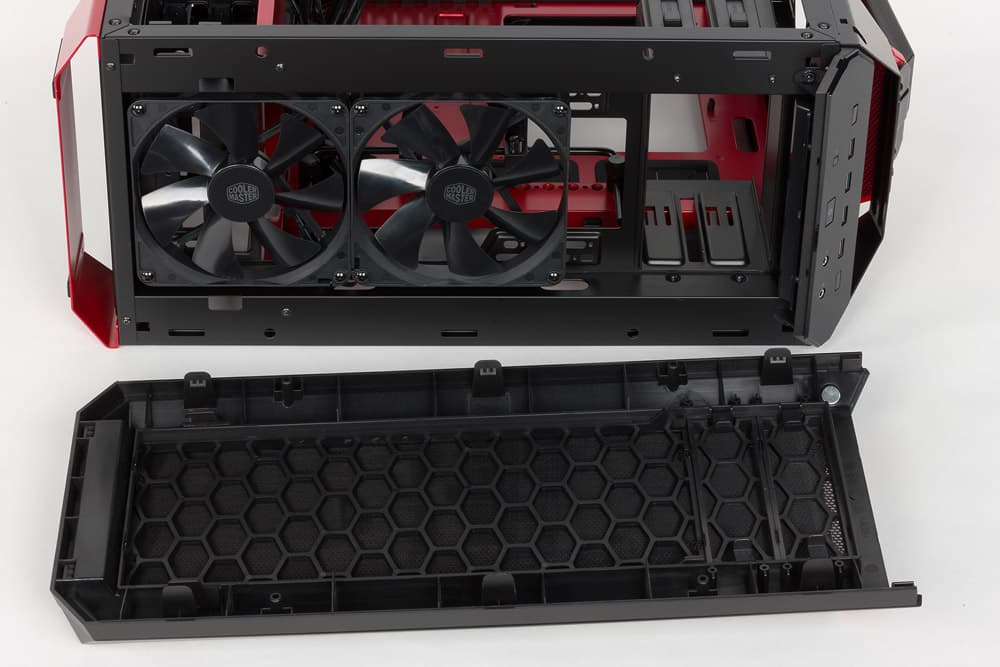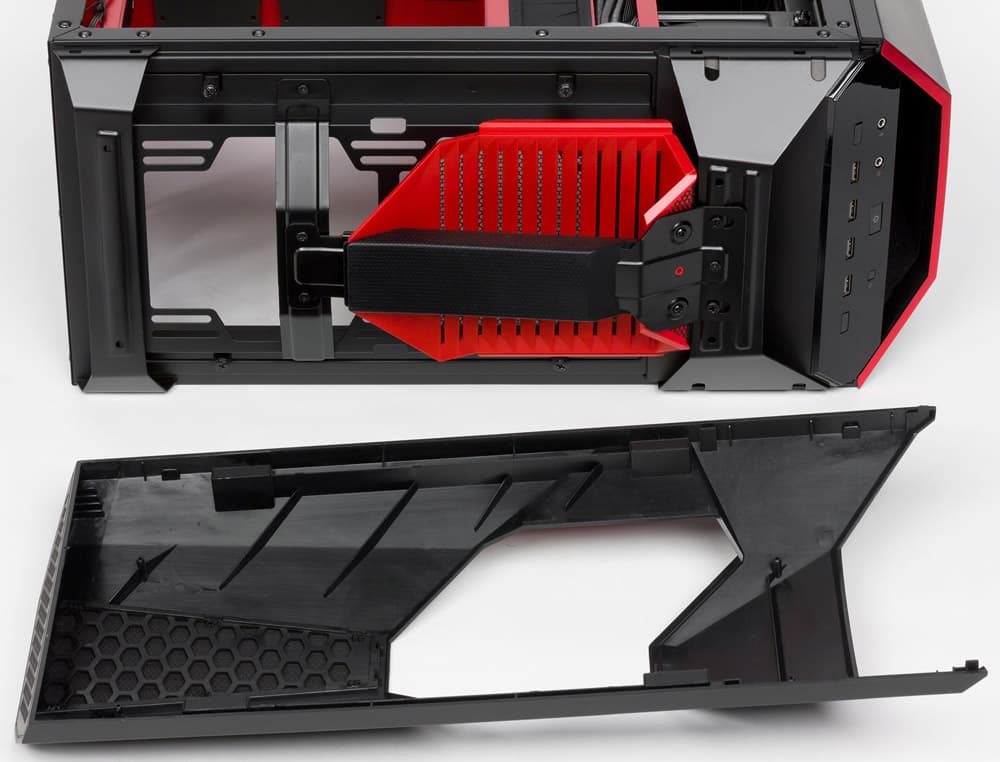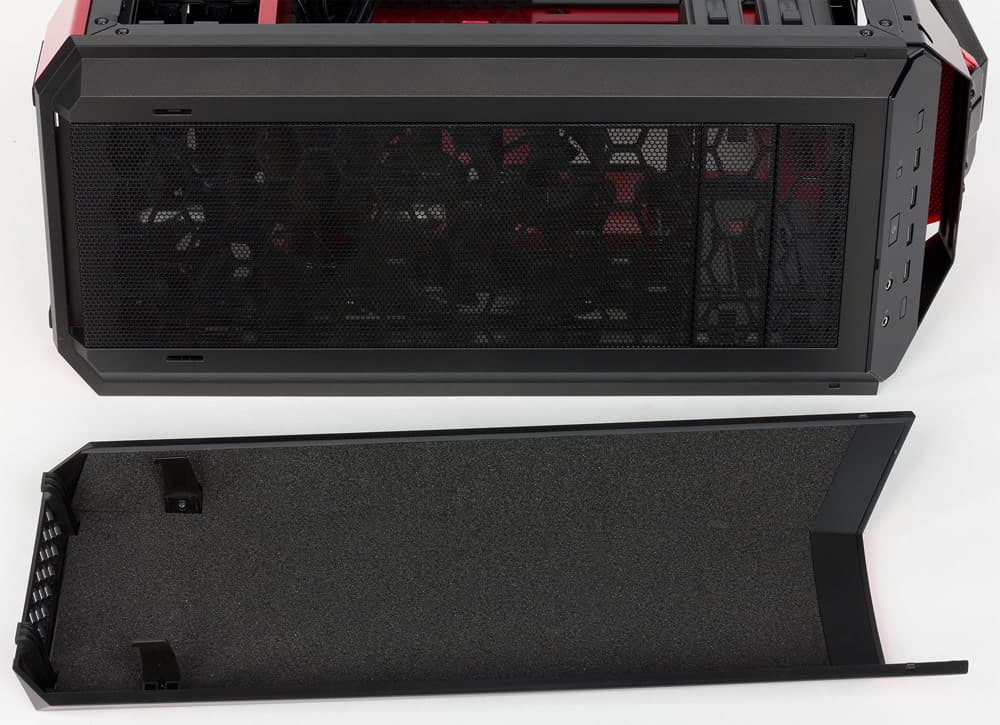 Фронтальная плоскость корпуса, скрывающаяся за этой панелью, почти целиком закрыта вентиляционной решеткой, которая продолжается и на заглушках пятидюймовых слотов. Верхняя грань откидной крышки сделана открытой, а на нижнем ее торце есть отверстия; всё это призвано обеспечить приток воздуха.