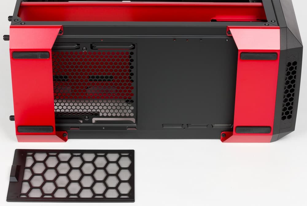 Вверху ситуация такая: имеется три области с вентиляционными отверстиями. Поскольку вентиляторы здесь обычно ставят как вытяжные, чтобы не препятствовать, а помогать естественному движению теплого воздуха, то фильтры должны препятствовать попаданию пыли внутрь компьютера при выключенном питании. То есть область, находящаяся в заднем торце верхней крышки, в фильтре попросту не нуждается.
