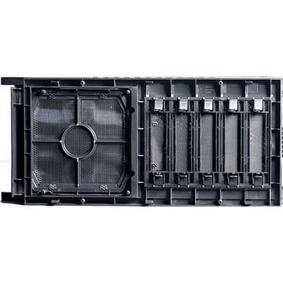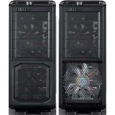 Большая площадь передней панели имеет сетчатую структуру, представляя собой огромное вентиляционное отверстие. Такое решение часто встречается в геймерских корпусах. Передняя панель имеет встроенные пылевые фильтры в заглушках отсеков типоразмера 5,25 дюйма, а также отдельный быстросъемный фильтр перед фронтальным вентилятором.