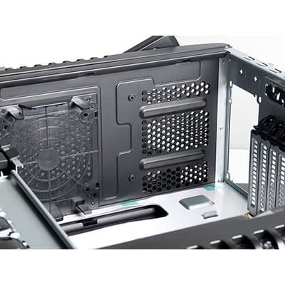 Причина кроется в конструкции корпуса. Фронтальный вентилятор нагнетает воздух не в закрытый объем, а по сути «на улицу», так как на боковой стенке находится огромное вентиляционное отверстие. Аналогичным образом функционирует и верхний вентилятор, прокачивая не только прогреты воздух из внутреннего объема, но и забранный по кратчайшему пути через боковое вентиляционное отверстие воздух «с улицы».