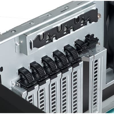 Фиксация плат расширения производится при помощи безвинтовой системы крепления, которая имеет не особо высокую надежность и качество фиксации. Люфт в продольном направлении весьма заметен. Однако, можно воспользоваться и стандартными винтами, для чего не нужно демонтировать системы безвинтового крепления, достаточно только отвести штатное крепление в сторону и вкрутить винт.
