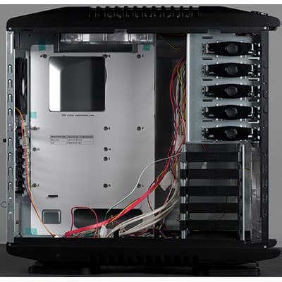 Боковые стенки имеют высокую жесткость и толщину около 0,8 мм. Жесткость отсека для жестких дисков находится на невысоком уровне в связи с применением стали недостаточной толщины и наличия больших отверстий в боковинах отсека. Правда, за наличие столь больших отверстий в боковинах отсека разработчиков стоит похвалить, так как они выполнены для снижения аэродинамического сопротивления воздушного потока от нагнетающего фронтального вентилятора, что повышает эффективность его работы и снижает шум.