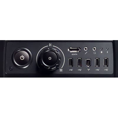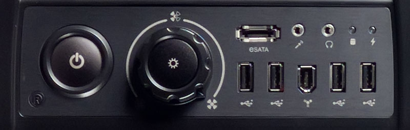 Фронтальные порты ввода-вывода расположены у данного корпуса в передней части верхней панели, что наиболее удобно при напольном размещении. В состав блок фронтальных разъемов входят: