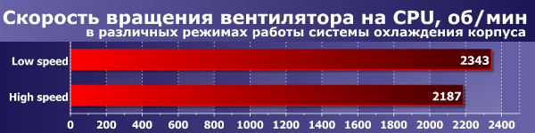 Уровень шума системы охлаждения корпуса изменяется в широких пределах в зависимости от напряжения питания вентиляторов. При пониженном напряжении питания система охлаждения корпуса обеспечивает очень низкий уровень шума даже с учетом настольного размещения корпуса, при больших расстояниях подобный уровень шума будет малоразличим даже в тихой комнате. При питании от 12 вольт уровень шума приближается к эргономичной границе (40 дБА) в случае настольного размещения, а в случае напольного размещения уровень шума можно оценить как находящийся на среднем уровне (32 дБА).