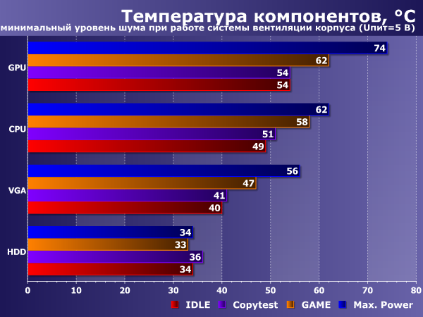 Эффективность охлаждения компонентов находится на хорошем, хоть и не рекордном уровне. Температура GPU в районе 70 градусов вполне типична в нашем случае; стоит отметить низкую температуру жесткого диска как в случае питания вентиляторов от стандартных 12 вольт, так и в случае питания от 5 вольт — так что корпусу по силам обеспечить охлаждение не только достаточно горячих игровых платформ, но и нескольких дисков, возможно, даже в массиве. Правда, вообще без обдува оставлять диски не стоит.