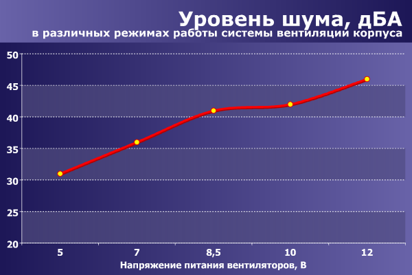 При питании вентиляторов напряжением от 5 до 7 вольт шум системы охлаждения корпуса можно оценить как находящийся близко к среднетипичному уровню для жилого помещения в дневное время суток при условии настольного расположения корпуса и размещения пользователя в ближнем поле от него. Источник с подобным уровнем шума не будет особенно выделяться в жилом, а тем более офисном помещении. В случае размещения корпуса на полу или на тумбе под столом уровень шума несколько снизится, и в этом случае можно будет трактовать шум как пониженный.