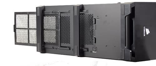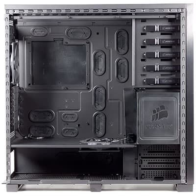 На сайте компании Corsair указано, что данная модель корпуса является трехобъемной, то есть имеет три независимых отсека. В принципе, три объема в наличии, так блок питания и жесткие диски устанавливаются в отдельные отсеки, но дело в том, что все объемы в данном корпусе сообщаются посредством системы принудительной приточно-вытяжной вентиляции. То есть, в данном случае это является осознанным техническим решением, а не недоработкой создателей.