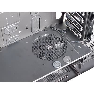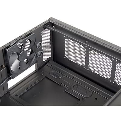 Из нижнего объема корпуса воздух нагнетается в основной объем, где располагается системная плата и другие компоненты платформы. Также, из нижнего объема воздух поступает в отсек для жестких дисков, который обособлен с двух сторон пластиковыми кожухами, один из которых выступает в роли воздуховода и используется для направления воздуха из нижнего объема к вентилятору, установленному на боковине отсека для жестких дисков. Вертикальное расположение вентилятора, обдувающего горизонтально расположенные жесткие диски, является типичным, но зачастую имеет один недостаток, заключающийся в наличии каких-либо дополнительных элементов корпуса, установленных перед вентилятором, что в итоге может приводить к увеличению аэродинамического сопротивления на входе вентилятора и другим негативным явлениям.