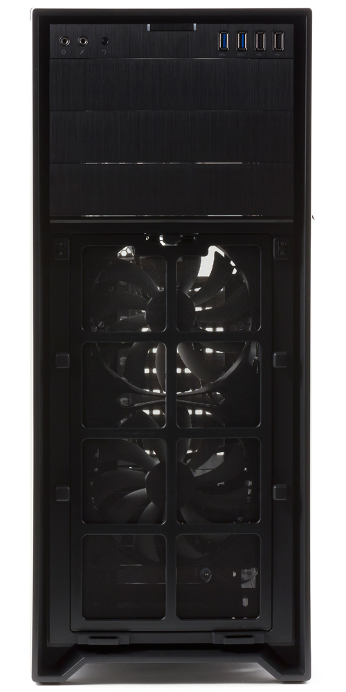 Два штатных вентилятора, установленных в качестве нагнетающих, расположены на фронтальной панели шасси. Изначально они установлены на максимальном расстоянии от днища, что ограничивает их воздействие на расположенные внизу дисковые корзины. Но монтажные отверстия позволяют переставить один или оба вентилятора пониже (примерно на 5 см), а также заменить на 120-миллиметровые модели.