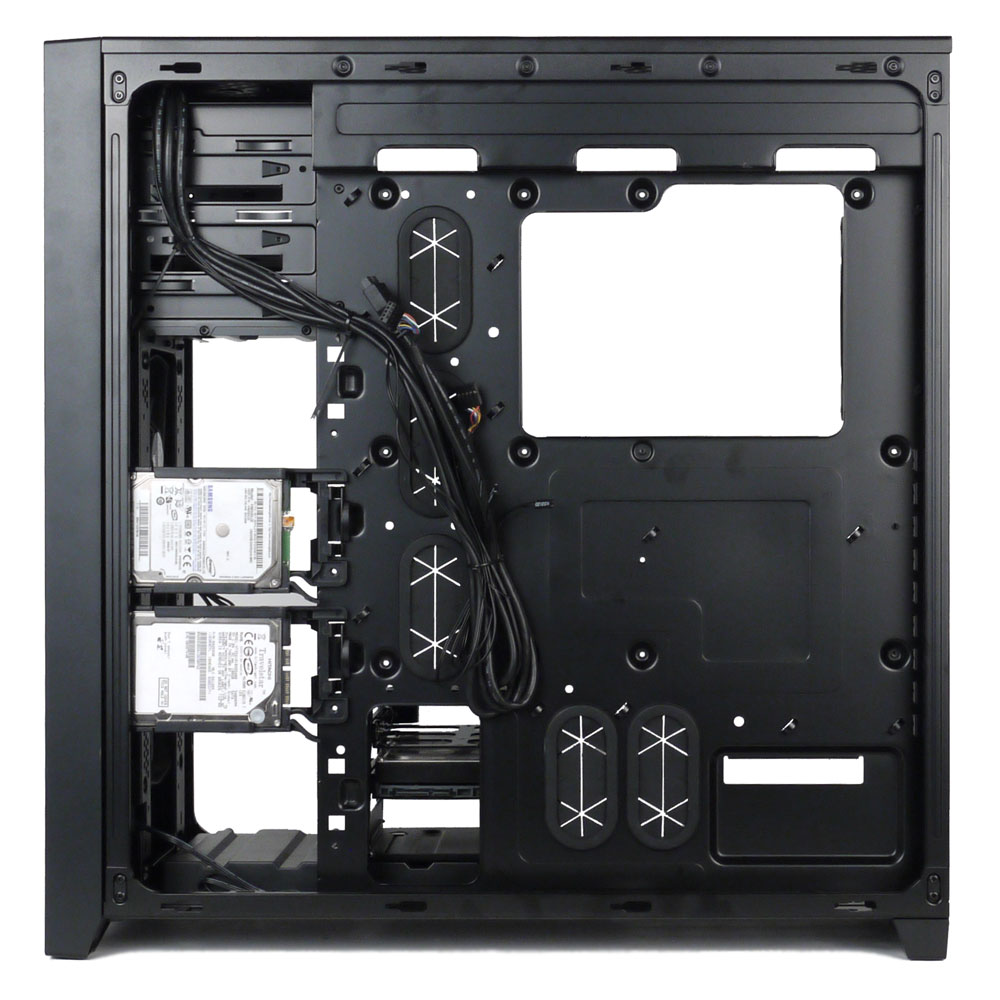 Шасси и боковые панели изготовлены из стали толщиной 0,7 мм, и при таких габаритах жесткость получилась не слишком высокой, что особенно сказывается на левой боковой крышке, имеющей большое окно. Правда, при снятии и установке боковых крышек выручает распашная система крепления: крышки снимаются поворотом вокруг передней кромки, и недостаточная жесткость на удобстве работы особо не сказывается.