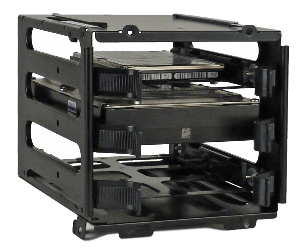 Рамки для 2,5-дюймовых накопителей, устанавливаемые справа, крепятся защелками, равно как и накопители в рамках. Накопитель в рамке сидит довольно плотно, но есть возможность закрепить его винтом; если же этого не делать, то SSD/HDD можно будет извлекать без снятия самой рамки.