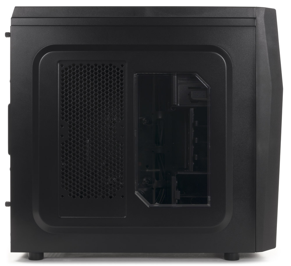 Ближнюю к передней панели часть левой боковой стенки занимает окно со слегка выступающей прозрачной вставкой, за ней расположена зона с отверстиями для дополнительных вентиляторов.