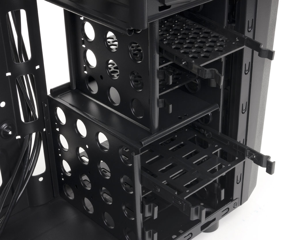 2,5-дюймовые накопители к салазкам крепятся винтами снизу, а для 3,5-дюймовых предусмотрено безвинтовое крепление: предназначенные для них салазки раздвижные, и в каждой половинке есть штифты. Нельзя сказать, что крепление получается очень уж прочным, да и сами салазки при установке в отсеки имеют некоторый люфт (а фиксации винтами нет), но в общем и целом всё в пределах разумного, да и вставлять-вынимать салазки с накопителем можно одной рукой.
