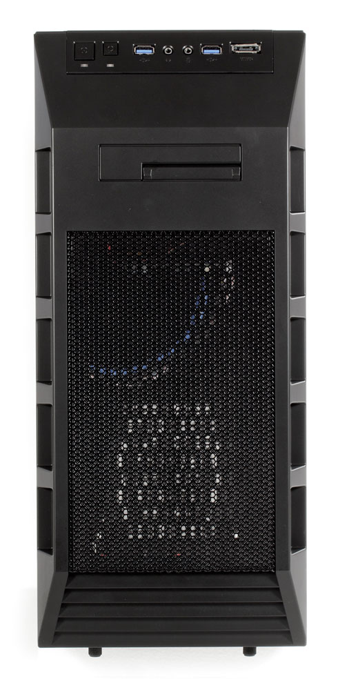 Лицевая часть корпуса имеет сложный рельеф, местами довольно глубокий. Так, по обоим бокам идут вертикальные ряды крупных пазов, в которые входят защелки заглушек 5,25-дюймовых слотов и двух распашных дверей, расположенных в нижней половине панели. Верхняя дверца побольше, она нужна для доступа к лицевому вентилятору — например, с целью очистки его самого́ или сетчатого фильтра. За нижней дверцей находятся оба hot-swap-контейнера для дисков.