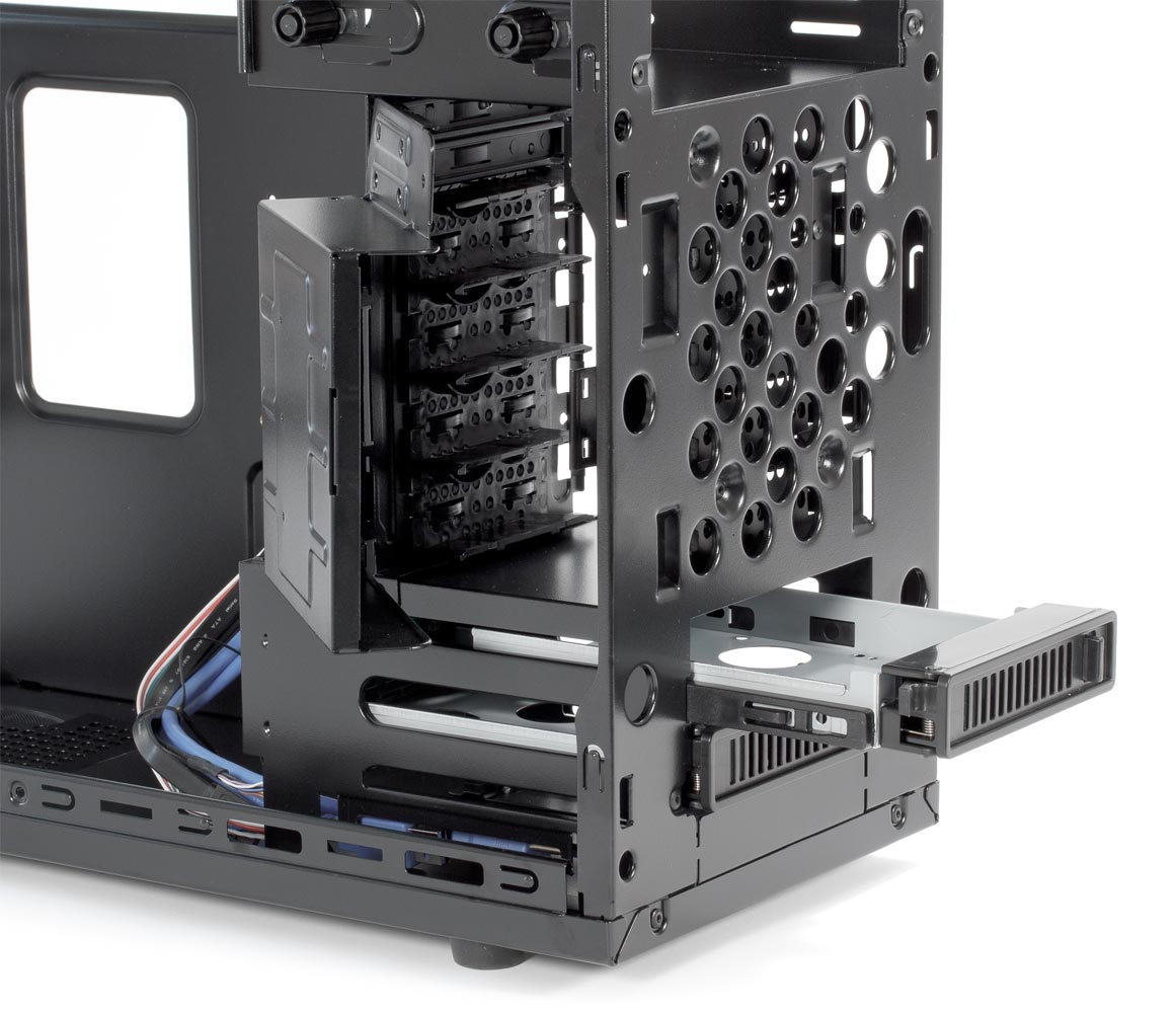 Зато жестких дисков можно установить аж девять, причем в самых разных вариантах. Имеется поперечная корзина на четыре 3,5- и два 2,5-дюймовых диска; в нижней части лицевой панели за небольшой дверцей скрываются два контейнера для 3,5-дюймовых дисков с возможностью оперативной замены. Наконец, на верхней панели имеется прикрытая подпружиненными шторками прорезь для отсека, в который можно устанавливать как 3,5-, так и 2,5-дюймовый SATA-накопитель (HDD или SSD).