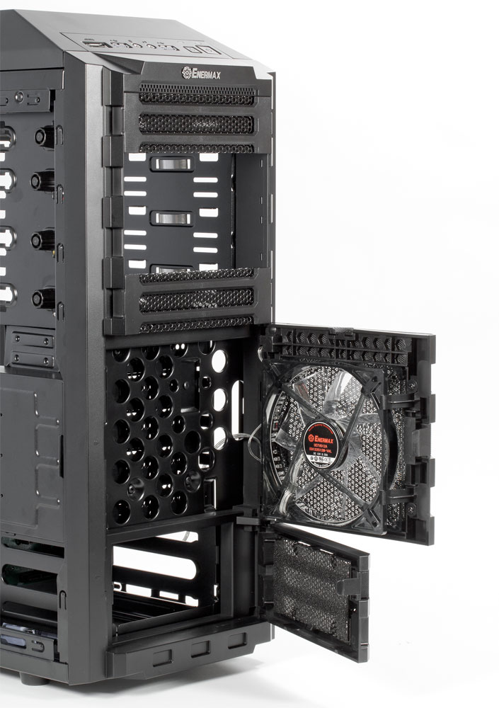 Один из них — Vegas, собственного производства Enermax, закреплен на дверце лицевой панели. Правда, эффективность его весьма сомнительна: хотя в передней стенке шасси есть много крупных отверстий, зато расположенная сразу за ней стенка корзины для HDD имеет всего лишь несколько рядов отверстий малого диаметра, часть из которых к тому же будет перекрыта боковинами установленных дисков.