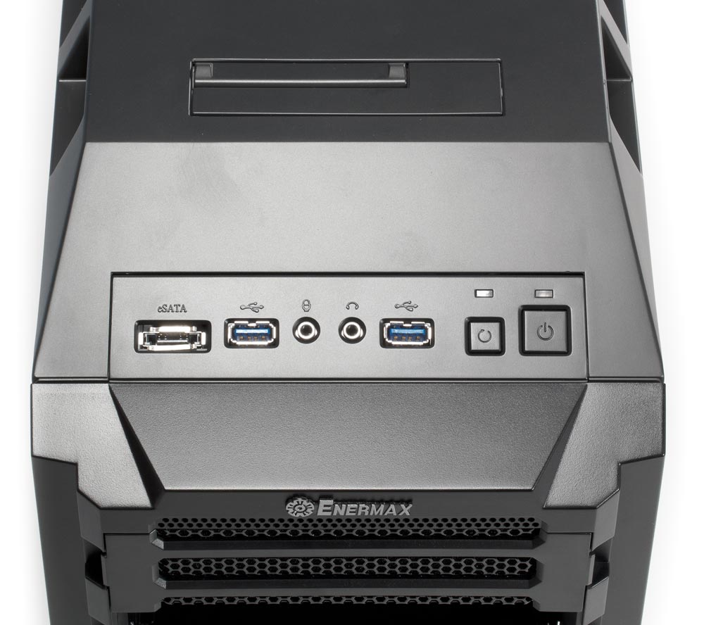 Кнопки и разъемы размещены в один ряд на скошенной вперед части верхней крышки; такое расположение будет удобным для доступа к ним при любом размещении корпуса — как на столе, так и на полу.