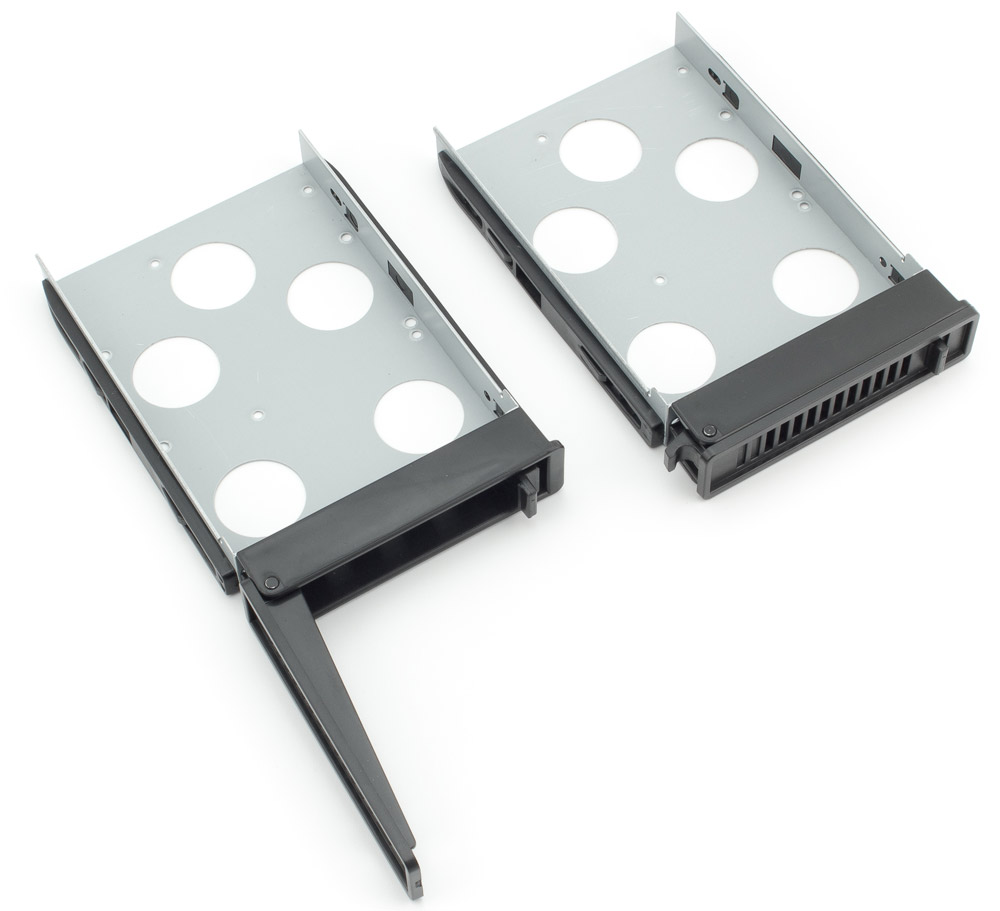Сами диски крепятся в контейнерах винтами из комплекта; металлический каркас контейнера способствует дополнительному отводу тепла от диска, а пластиковые направляющие контейнеров немного амортизируют вибрации от работающего диска.